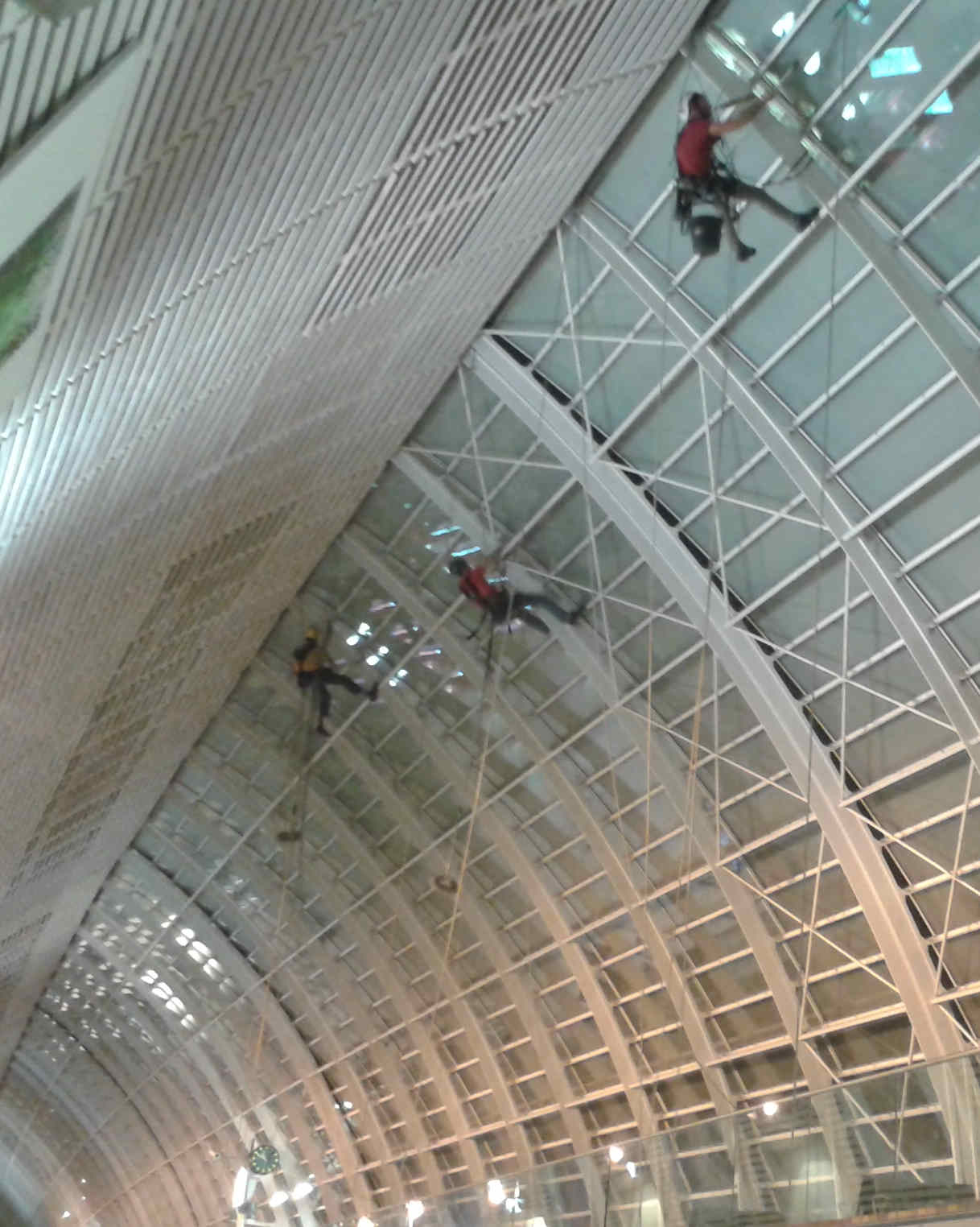 Dépoussiérage du bardage en bois et des structures de la nef de la gare Avignon TGV depuis 2016.